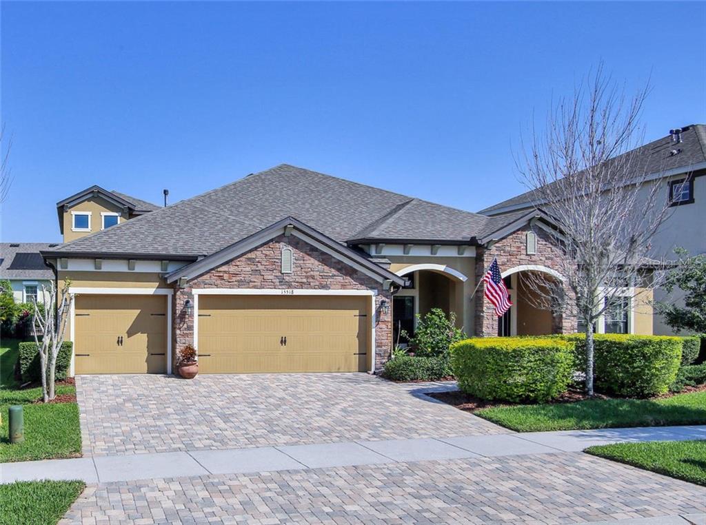 Get ready to fall in love with this floorplan! the cardel torino boasts over 3,800 square feet and is a gorgeous open plan that features 4 bedrooms, 3 1/2 bathrooms, home office, bonus room, 3 car garage and a covered/screened lanai overlooking tropical landscaping and a fully fenced backyard. a beautiful pavered driveway and stacked stone elevation welcomes you through a front porch sitting area into a magnificent foyer showcasing rich hardwood flooring and 12 foot tray ceilings. the front of this home features french doors opening to the large home office and also a formal dining area. this dramatic entry continues continues to the spectacular grand room showcasing the kitchen, breakfast area, and family room. designer upgrades include an all-stainless kitchen with 42 inch cabinets, led lighting, backsplash, granite counters, dining island, and a walk-in pantry. the stunning heart of this home features 12 foot tray ceilings and pocket sliders flowing to the covered and screened outdoor living area overlooking the spacious and fully fenced backyard! the master suite features walk-in closets, tray ceiling and a sitting area with private sliders to the lanai. the luxurious master en-suite features an oversized shower, his & hers vanity areas and a soaking tub. all 3 additional bedrooms, 2 full baths (one with access to the lanai), and laundry room are located on the main floor. upstairs is playtime and boasts a massive bonus room complete with half bath! zoned for a-rated schools, this is the one!Single Family House 4 bedrooms - STARLING/FISHHAWK PH 2C-1