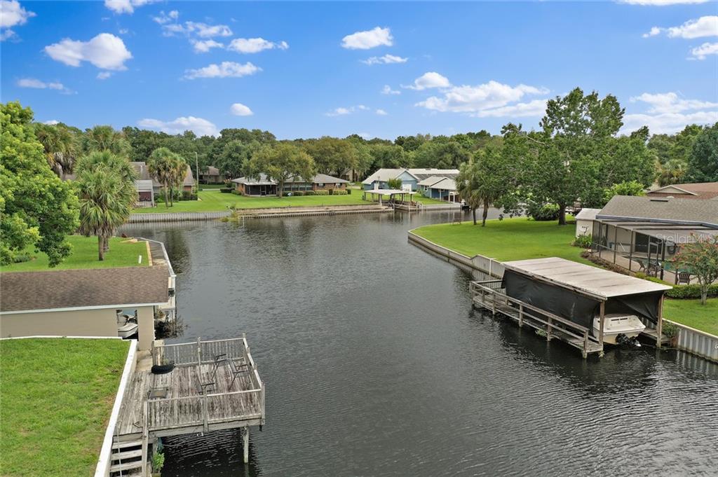3/3 canal front home with boathouse. direct access to lake eustis and chain of lakes. enjoy a convenient location with every amenity nearby while being tucked away in the tranquil, well-established vista del largo community where you can truly live the florida lifestyle with direct water access! attractive, low maintenance brick facade with covered entry, 2-car attached garage and large driveway for abundant parking. back yard with swaying palm, majestic oak, sparkling waters of the wide canal and private boathouse will lure you to relax outdoors or hop in your boat for a quick ride to beautiful lake eustis! inside this 2,172 sf home is a bright, open split bedroom floor plan with multiple entertaining spaces for family and friend gatherings! tiled foyer and spacious carpeted living room flow into a tiled kitchen and dining room with gorgeous hardwood floors. kitchen with neutral appliances, loads of cabinetry and small breakfast bar. the dining room has a doorway to a 12x26 family room with wood floors, brick fireplace and large windows with glorious panoramic canal views! the private master bedroom offers a walk-in closet and full bathroom with tiled shower. 2 guest bedrooms share an updated bathroom with 2-sink granite vanity and a beautifully tiled tub/shower. wonderfully convenient laundry room includes a third full bathroom. 10x10 enclosed exterior storage room. relax or entertain on the covered, screened 10x40 rear lanai or spend the day boating on the coveted harris chain of lakes!Single Family House 3 bedrooms - VISTA DEL LARGO