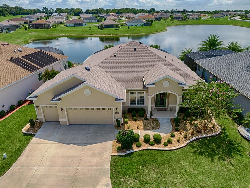 Spectacular water view-stonecrest adult gated golfing community with all the amenities. this home is the perfect premier custom home, with breathtaking sunrises and pond view! professionally landscaped yard with rock islands and stone enhancements. upon entering the glass etched front door, your eye will continue to flow out to the lake view. spacious living room w wet bar, and adjacent family room, pocket doors. gorgeous new laminate flooring through out most living areas, ceramic tile flooring also, 10 ft ceilings, 2771 sq ft of pristine beauty, hickory cabinets with self closing cabinets and drawers, crushed granite deep sink, cambria counters (step above granite), exquisite lighting, solar tubes, recessed lighting, under kit cabinets lights enhance the glass stone backsplash. cambria counters in the laundry room with crushed granite sink, two car garage, golf cart garage with extended room for storage, workshop or additional golf carts, expanded driveway. master bed room suite has walk in closet, double sink, soaking tub, and a terrific walk in shower. energy saving the nest thermostat. security ring door bell huge screened lanai with bird cage and summer kitchen. eight ceiling fans included, plantation shutters. this home has it all! you really must put this home on your list to see today! from the moment you walk through the front door, you will experience the comfort that will make you want to call this home. please view our virtual video tour.Single Family House 3 bedrooms - STONECREST