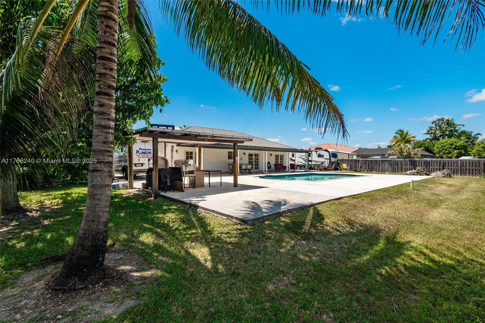 Reduced! don't miss this wonderful single-family ground-level home with pool and huge .40acre (17,101 sq. ft.) lot. this popular split-floorplan features 5 bedrooms, 3 full baths and a two-car garage. the garage has been converted into a spacious living area with full bathroom with own entry door and walk-in closet. entertain guests and relax in the serene pool area with covered terrace, with room for a tiki hut/gazebo and/or additional landscaping of its expansive yard. the home boasts privacy fencing, circular concrete driveway, hurricane panels, gutters at front/rear and is tiled throughout with upgraded kitchen and bathrooms. no hoa. large gates on both sides of home for a boat, rv/truck. multiple mature fruit trees: mango, coconuts, plum. easy to show!Single Family House 5 bedrooms - BLACK CREEK ESTATES