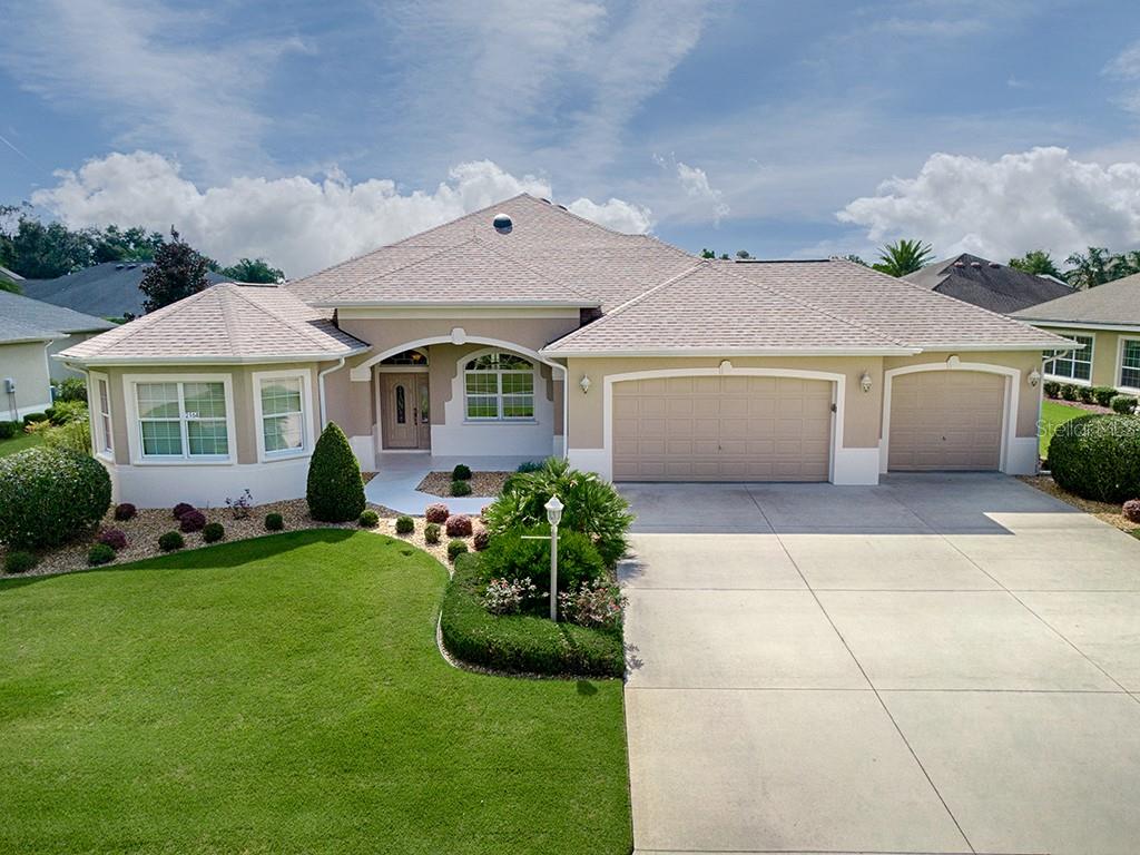 This is an expanded premier williamsburg with a three-car garage in the exclusive village of bridgeport at miona shores! this beautiful home provides nearly 3200 sf of living space and features a huge (565 sf) florida room! beautiful procelain tile is found throughout the living areas. with neutral carpet in the bedrooms. the kitchen provides rich wood cabinetry with over and under lighting accenting the gorgeous granite counters. stainless appliances include a gas range and newer microwave and bottom-freezer refrigerator. the dining room is centered with a beautiful chandelier and framed by graceful columns. custom crown molding is found throughout, with additional custom woodwork and lighting in the living room's trey ceiling. french doors lead to the huge florida room with walls of windows (cellular shades provide privacy). the master bedroom has double walk-in closets and access to the florida room. the master bath offers a jacuzzi tub, granite counters, dual-sinks, a vanity, and a roman shower! the guest area is separated with a pocket door and offers two comfortable guest rooms (both with closets) and a guest bath with a granite counter and a tiled tub/shower combination! step into the awesome custom lanai to find a perfectly designed space with columns, textured cement floor, and a trey ceiling! the home has a new roof (2015), dual ac units (16 & 14 seer), and a climate-controlled storage room in garage. this beautiful home is located in a super convenient location, with too many upgrades to list!Single Family House 3 bedrooms - THE VILLAGES