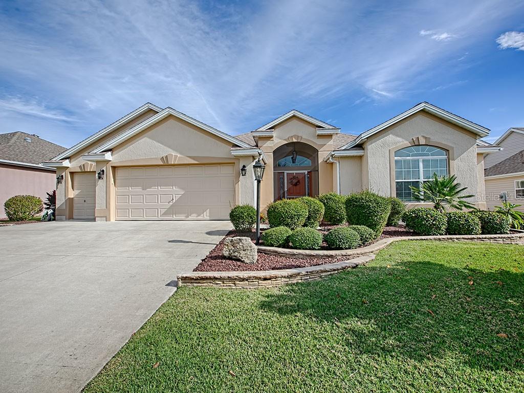 Lovely 3/2 lily designer w/1939 sq ft and 2+ golf cart garage in the village of duval. this home offers beautiful curb appeal w/shrubs, palms, stack rock walls & screened front entry. large diagonal tile enhances the foyer, living, dining, kitchen and bathrooms, beautiful laminate flooring in the bedrooms, and rounded corners! the kitchen offers pendant lighting over the breakfast bar, closet pantry, upgraded toffee maple cabinets w/crown molding & under-counter molding, hardware, pull out drawers, granite counters, upgraded stainless appliances, electric smooth top electric range, french door refrigerator and a solar tube! the casual dining area and living room open w/sliding glass doors to the enclosed lanai w/tile flooring, separate a/c unit and sun shades. off the lanai is your 9x25 birdcage. the master bedroom features beautiful laminate flooring, tray ceiling, large closet w/built-ins, en suite master bath w/tiled walk-in shower, his/her sinks, vanity, window, pocket door to separate commode area, linen closet & solar tube. off the foyer a pocket door leads to the spacious front bedroom w/vaulted ceiling, large bay window & built-in “murphy” bed w/cabinets. the second guest bedroom is currently used as an office. the guest bath features tile flooring, tile surround shower/tub & solar tube. the laundry room has extra cabinets & a large sink. the spacious garage has attic pull down stairs, epoxy painted floor, cabinets and a nova water filtration system. outside was painted 2 years ago! super home!Single Family House 3 bedrooms - THE VILLAGES