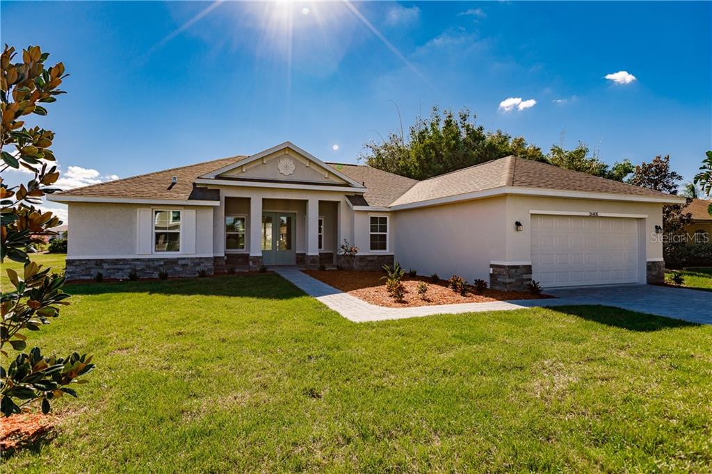 This brand new home with greenbelt view in the deed restricted community of deep creek can be yours. home offers great room concept with bright and open split floor plan with over 2100 square feet of living space. open floor plan provides lots of possibilities for your living arrangement with room for living and dining areas, family room, and spacious kitchen. features include soaring 20 ft tray ceiling in great room, wood look ceramic tile in main living areas, color accent walls, decorator light, fan, and plumbing fixtures, and recessed lighting. kitchen boasts granite counters, tile back splash, stainless appliances, warm wood cabinetry with deep drawers, large walk in pantry, and island with decorative pendant lighting and breakfast bar that opens to the living and dining areas. master suite is accented with tray ceiling and has spacious walk in closet, and private en suite bath with dual sinks and free standing soaking tub. both master and 2nd baths have granite vanities with under mount sinks and custom tiled showers. dedicated laundry room has utility tub, overhead cabinets and work counter. other features include impact resistant windows and public water and sewer. you will enjoy relaxing on your screened lanai overlooking the beautiful greenbelt which provides a great view and privacy. beautiful curb appeal with brick paved drive and walkway, stone veneer accent walls, fully sodded and landscaped, and welcoming pillared front porch. proximity to waterways, local beaches, dining, shopping, and golf courses makes this property ideal for the florida lifestyle. also, easy access to public parks with bike and walking trails and picnic areas, and boat ramps providing access to many waterways including the peace river, beautiful charlotte harbor, and the gulf of mexico. quiet neighborhood yet all conveniences and amenities nearby. and easy access to interstate 75.Single Family House 3 bedrooms - PUNTA GORDA ISLES SEC 23