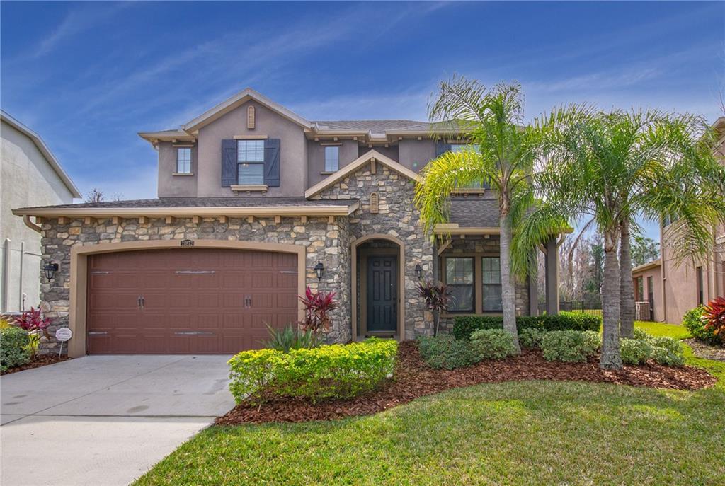 Estancia - nearly new and meticulously maintained! beautiful 2-story home features 5 bedrooms, 3 ½ baths plus bonus room. main floor features 6x24 wood plank ceramic tile. a formal dining, open kitchen, great room, casual dining area, laundry and master. the heart of the home features an impressive gourmet-inspired kitchen with a butler’s pantry, oversized center island, chef style 5 burner gas cooktop, wall ovens, microwave, granite countertops, stainless-steel appliances. 42" cabinetry adorned with crown molding & oil rubbed bronze hardware. master ensuite complete tray ceiling has exceptional spa-like master bathroom offering a walk-in shower, elegant tiles, dual vanities. very spacious upstairs with bonus room and 4 additional bedrooms. located on a lot with beautiful tree views from the living areas. plenty of room to add a pool. additional features include: whole house water filter with water softener, surround sound wired into family room and lanai, and gas line roughed in on the rear patio ready for an outdoor kitchen! top a rated schools!! zoned for wiregrass ranch school district! estancia is a resort style community and has many options to maintain an active lifestyle for all ages. some of the amenities include a 7,000 square feet amenity center, resort-style pools, fitness center, tennis and basketball courts, nature trails, park, and playground. excellent centralized location just off bruce b downs and minutes from the shops at wiregrass, advent health hospital, tampa premium outlets, the grove, restaurants, and more. convenient to i-75 and i-275.Single Family House 5 bedrooms - ESTANCIA PH 1D