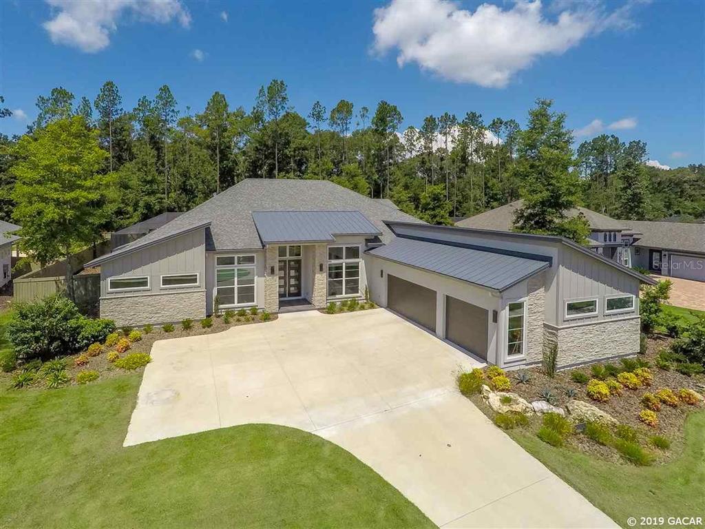 This sensational, better than new, pool home was built by warring homes in 2017. it features a clean, crisp and contemporary design with exquisite wood floors, gorgeous exposed beam ceilings, abundant windows, outstanding natural light and an exceptional floor plan with 4 bedrooms, a downstairs rec-room and a study. the chefs kitchen radiates charm and style with quartz counters, spectacular cabinetry, stainless appliances, a walk-in pantry, wine chiller and wet bar. the large master retreat includes his and her walk-in closets, dual vanities, a walk-in shower, separate tub and a beautiful interface to the back porch. relax or entertain on the picturesque, paver patio overlooking the sparkling, solar-heated, salt water pool and gas spa. the spacious yard fronts & backs to community buffer with no rear or front facing neighbors! additional upgrades totaling over $75,000 include a 3-car garage, a climate controlled wine cellar, spray-foam insulation, whole house vacuum system, surround sound, solar heat for pool, designer-linear gas fireplace, over-sized laundry room, and a-rated schools and an exceptional location close to shopping, schools, parks and an easy commute to shands and uf!Single Family House 4 bedrooms - Estates of Wilds Plantation