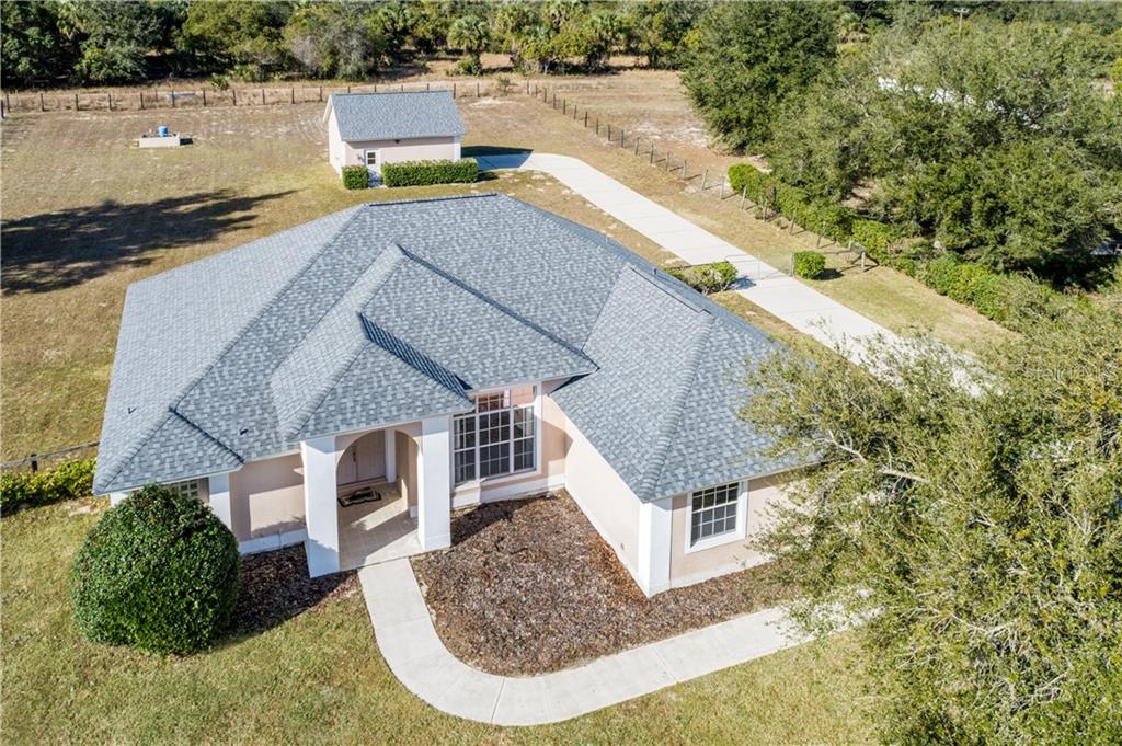 Spread out on this one acre homesite and love your view from your front door to your back door! well built concrete block home with new roof in 2019 on house and 24' x 24' detached garage & workshop. possible in-law quarters with tons of upstairs storage over workshop, 16' overhead garage door, concrete floor, built in shelving, side entry door and even an air compressor that will have any man grinning. if you love open space, you'll love the high ceilings, large rooms and abundant windows in this home. kitchen opens to family room and flex space that could work as a home office, play room or fabulous new dining area. nice size bedrooms and an oversized master suite with two walk in closets and built in entertainment unit with access to covered lanai through french doors. light and bright family room that leads to the large covered lanai with roll down shades for your afternoon enjoyment, with plenty of room for a future pool. this ideal home has an attached two car garage with exterior access key pad, automatic garage door opener and extra wide concrete driveway and parking pad so visitors never have a problem parking. enjoy the separate concrete driveway that leads to the detached garage and back yard allowing for easy access to your boat/rv and other toys. only $100 year hoa!!! the hills is an established neighborhood close to everything including 441 and the new 429 expressway with easy commute to orlando and surrounding areas. ***seller will give a $7,500 flooring concession***Single Family House 3 bedrooms - HILLS MOUNT DORA
