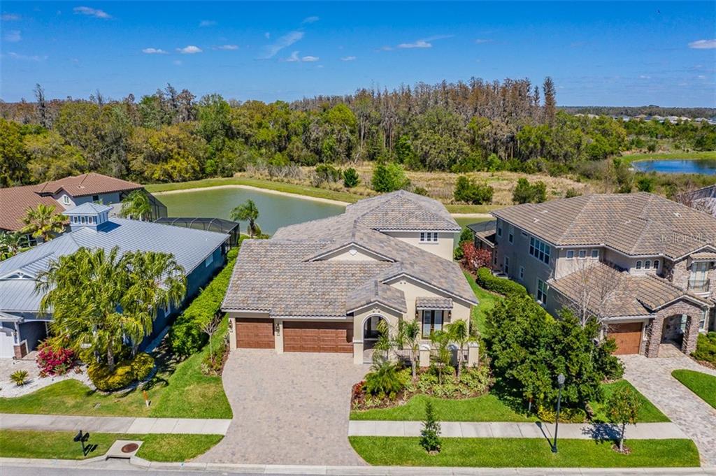 Luxurious custom built executive home with elegant high end amenities situated on pond & conservation lot in one of the private gated villages of wategrass. this well designed beauty has stainless appliances, abundant cabinets, granite sink, built-in buffet, granite countertops & oversized center island in well appointed chefs kitchen with adjoining breakfast and great room. lovely trayed ceilings with crown molding, 8' doors throughout, large laundry with plenty of cabinets and sink. the spacious downstairs living space also boasts: office, formal dining, owners retreat with sitting room, stunning spa bath with dual sinks & vanities, european soaking tub, huge shower w/dual shower heads, body jets, and overhead rain shower, dual closets, 2 additional bedrooms & 2 additional full baths plus outside half bath. upstairs you will find a large 4th bedroom w/full bath, game room and media room. just imagine yourself living in your brand new custom built dream home. neighborhood features: resort style zero entry pool & splash zone, 6 ln jr olympic pool, & pool by new pavilion. fitness center, club house, tennis & basketball courts, large & small dog park, splash pad, 2 large parks with playground plus multiple private sports courts with playgrounds & basketball courts throughout neighborhood. watergrass elementary school in neighborhood, brand new charter school right outside of neighborhood, excellent location, close to great schools, pasco hernando jr college, saint leo university, adventhealth hospitals, wire grass mall, tampa premium outlet mall, ice rink, sams club, costco, movie theater, and lots of dining. easy access to i75, 275, tampa interational airport and downtown tampa.Single Family House 4 bedrooms - WATERGRASS PCLS B-5 & B-6
