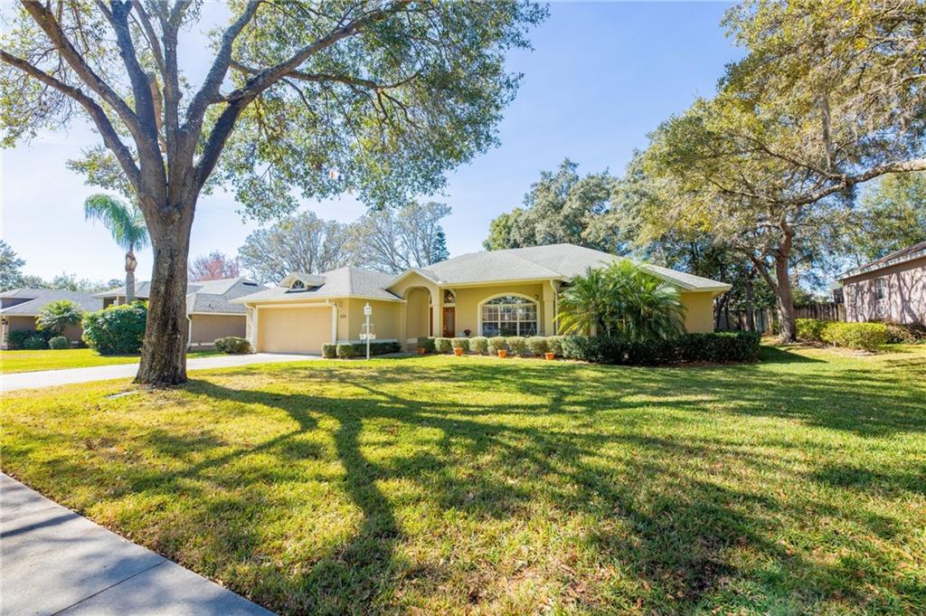 This spacious 3 bedroom/2 bathroom, plus enclosed air conditioned florida room, boasts over 2400 sq feet and is situated on an oversized lot, landscaped with mature laurel oak trees. don't worry about cut-through traffic, because kimi court is a quiet cul de sac street. sip your morning coffee and relax on your porch swing, already hung for you on the front porch. enter into the home through the double wood doors, where you'll be ushered into the formal living room, which flows into the formal dining room, both of which feature vaulted ceilings and engineered hardwood flooring. the split floor plan features the master suite off of the dining room, which you can enter through the private french doors. the ensuite master bathroom features dual vanities, a jetted garden tub with separate shower stall, and a generous size walk-in closet. on the other side of the formal dining room, you will find the kitchen/ dining nook/ family room open concept. the kitchen is equipped with granite counter tops, solid wood cabinets, and is the perfect space for entertaining, with bar seating. there is tons of natural lighting, coming in through the bay windows off the nook, skylights overhead and through the nearby florida room, which overlooks the private backyard. and on the occasional chilly orlando evening, snuggle up by the wood burning brick fireplace, located in the family room. you'll find the two additional spacious bedrooms past the family room, with the second bathroom, which features carrara marble. off the garage, is the laundry room, with built-in upper cabinets above the washer & dryer, both of which convey with the home. this home has been meticulously and lovingly cared for by it's original owner and is ready for your loving touch. come and see it today!Single Family House 3 bedrooms - OAK LEAF