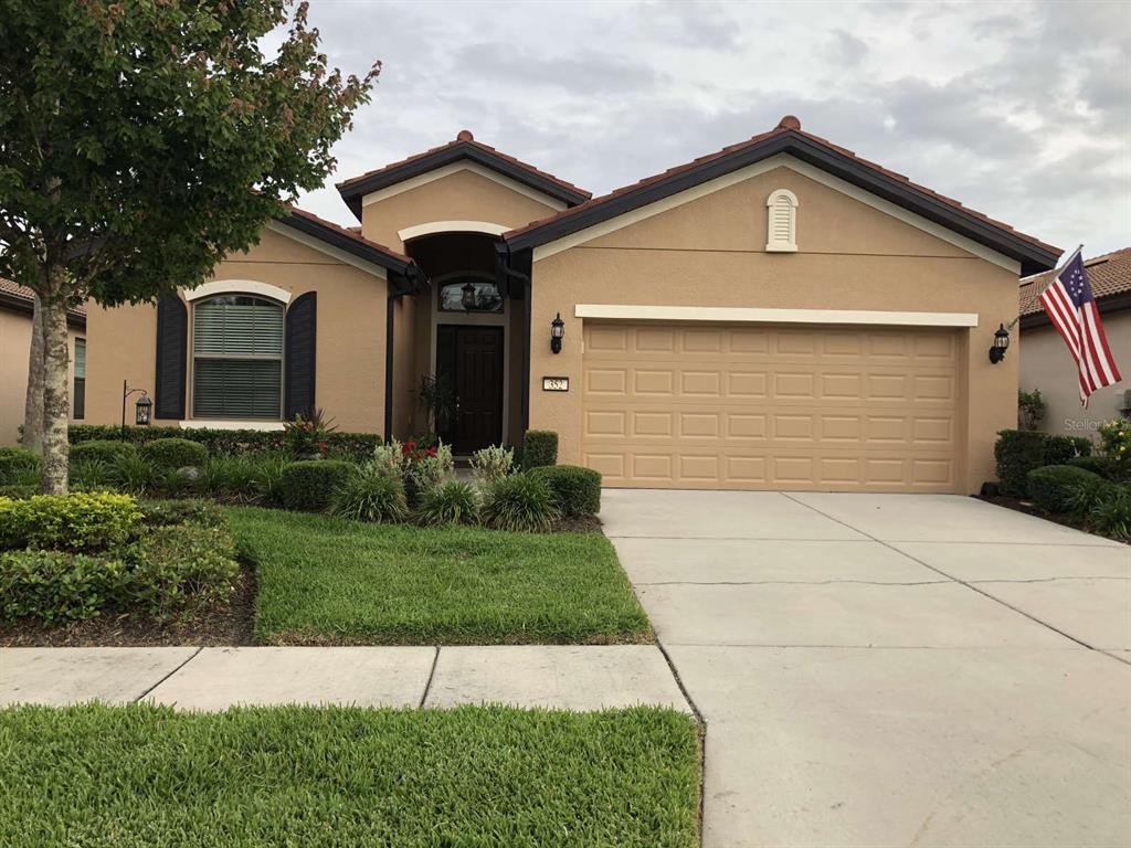 County water and sewer systems and underground utilities with sprinkler system. convenient to shopping, dining, and healthcare facilities. del webb southshore falls over 55 community with pulte builder. maintenance free, gated community with resort style amenities including 2 pools, spa, resistance pool, tennis and pickleball courts, exercise facility and much more. many organized activities for active adults. beautiful clubhouse with pool tables, library, arts and crafts area, coffee/computer room, and ballroom for social activities. designer neighborhood with sidewalks, walking paths, streetlights, many lakes, and landscaped common areas. immaculately maintained and beautifully landscaped home located on large community lake. hoa fees $330 per month; no cdd! ?2020 taxes $3,666.89? ********** open floor plan 2,165 sf (living area) and 2,912 sf total area one owner (built in 2013) single family home with 3 bedrooms plus den (possible 4th bedroom); 2 full baths. plenty of closets including walk-in closet in master br. built with $4,900 energy efficient package which includes: impact resistant and low “emissivity” windows, extra insulation, exterior vented microwave, special framing techniques, sealed ducts, fresh air ventilation, moisture management, air pressure balancing, and programmable thermostat – all designed to increase energy efficiency by at least 12%. central air with heat pump. den with double glass entry doors and high (9’), textured ceilings throughout and interior trim upgrade package including 5-1/4” baseboards throughout and 5-1/4” crown molding in main living area. oversized lanai (approx. 26’ x 19’) with new epoxy floor (2020), large 3 panel sliding doors, and 2 exit doors. attached oversized garage with garage door opener, epoxy floor, and utility tub. new premium water softener and whole home water filtration system (2021). block stucco with decorative tile roof and new exterior paint (2020). new ring doorbell (2021) and retractable screen door. designer hanging lights in foyer, dining area, and kitchen eating nook. custom fans throughout (main living area, bedrooms, den, and lanai). tile floors with premium carpet in bedrooms and den and window treatments. master bath with double sinks and tile shower; 2nd bath with shower and tub. 42” maple cabinets and granite countertops in kitchen and baths. eating bar with 2 stools. new (2021) kitchenaid 5 burner electric induction cook top with double convection oven, and whirlpool refrigerator, dishwasher, microwave, and washer and dryer. custom hurricane shutters and front decorative shutters.Single Family House 3 bedrooms - SOUTHSHORE FALLS PH 3C PT