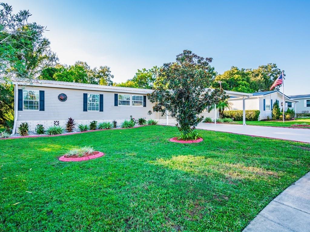 Gated grand horizons renovated home with 2018 new metal roof is ready for new owners! this jacobson home has been tastefully redone from sitting area on the left side yard to newly painted interior! landscape curbing, double carport covered parking on custom stained driveway welcomes you! leaded glass entry door opens to spacious living room with ceramic tile floors in main living areas. gourmet kitchen has granite center island that doubles as a breakfast bar with pendant lights. light, bright kitchen features kitchen aid wall oven, built in microwave, drop in cooktop with generous cabinets and triple window over the sink! family/gathering room opens to the kitchen with sliders to screen lanai overlooking private backyard. utility shed has exit door to the backyard with walkway to sitting area. spacious master suite has huge walk in closet... master bath ensuite has dual sinks, soaking garden tub, separate shower, loads of storage, new counters, lighting and mirrored medicine cabinets! guest bedrooms have walk in closets and are located on the opposite side of the home for privacy. wood laminate floor in bedroom 3 makes a great office or den with guest bath and interior laundry room on the same wing. situated on 2 lots, this huge home has over 2,000 sq ft. furnishings negotiable. bring your suitcase, move right in and enjoy the heated swimming pool, spa, shuffleboard, billiards, craft room, travel excursions, planned activities in this 55+ gated community. call today to see why this is the place to be!Manufactured Home 3 bedrooms - GRAND HORIZONS