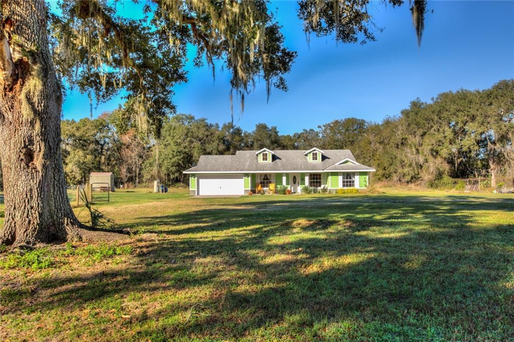 Welcome home to this country charmer. 3br, 2 bath, 2 car garage on 2 acres with tons of curb appeal!! side and rear of property is lined with mature trees to provide lots of privacy and creates a peaceful setting. side property is a body of water adding to the seclusion and providing an attractive backdrop. gonna see some deer here for sure! home has an open floor plan with vaulted ceilings. kitchen has lots of counter space and a nice window to the backyard. french doors off of the dining room to access the back porch. there is a large 11 x 6 utility room off the kitchen for added convenience. the master bedroom is spacious and has a walk in tiled shower in the master bath. all bedrooms are carpeted while main living areas are vinyl plank. the guest bath is nestled between the other two bedrooms it is tiled with a bathtub. there is also a shed 10 x 8 . front of the acreage is zoned agricultural. bring your family and pets to this sweet setting giving lots of freedom and space. minutes from i-75 and fl turnpike.Single Family House 3 bedrooms - N/A