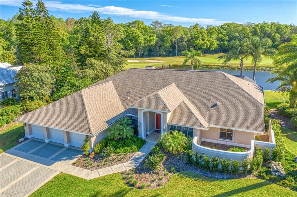 One or more photo(s) has been virtually staged. golf course and water views abound in this remodeled executive home in tampa palms. voted one of the top 10 view lots in tampa palms this signature property is a rare find indeed! perfectly positioned on an oversized homesite measuring almost 1/2 acre with deep views that span across a large rear yard, water, golf course and lush conservation with 3 bedrooms, office, formal living room, formal dining room, family room, 3 car garage, pool and spa. this home has been remodeled over the years with fine finishes that include a newer roof, newer exterior and interior paint, brazilian plank wood flooring, box beam ceilings detail, remodeled kitchen, updated bathrooms and an amazing lanai with resurfaced pool, spa and outdoor kitchen! a grand foyer welcomes you to the formal area which features walls of sliding glass doors overlooking one of a kind water and golf course view. the kitchen overlooks the family room, breakfast room and dramatic views. it has been updated over the years with granite counter tops, electric cooktop, stainless steel refrigerator, undermount sinks, recipe desk and oversized tile floor. the family room is impressive with custom box coffered ceilings, custom built-in entertainment center, cozy fireplace and walls of sliding glass doors. relax at the end of the day in the expansive master en suite. it features tray ceilings, bay windows and 5 1/4" baseboards. the master bath has been updated with slate tile floors, custom maple cabinetry, granite counters and large tub with mosaic tile trim. there is a powder bath located off of the formal area, perfect for large parties and a full bath that services the secondary bedrooms. the office is conveniently located off of the main foyer and boasts finishes that include custom built-in shelving, plantation shutters and beautiful brazilian plank wood flooring. you'll love the resort style feel of the lanai pool area. it has been updated with an elegant paver deck, outdoor kitchen with sink, resurfaced pool, heated spa and a private pool bath. this signature new listing is located walking distance to tampa palms elementary school, tampa palms golf and country club and just minutes to moffitt cancer center, advent hospital, usf, i-75, regional malls and parks. yes, you can have it all. welcome home!Single Family House 3 bedrooms - A REP OF TAMPA PALMS UNIT 1B