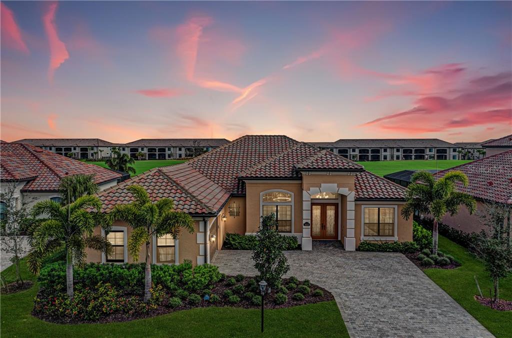 Sunrises, rolling greens, and memories await you at this exceptional golf inclusive estate home in lakewood national. from the moment you enter this light and airy bougainvillea model you will be captivated by its beauty. the expansive open concept floor plan offers volume ceilings, 8’ doors, triple sliders and hurricane impact glass windows. enjoy entertaining guests in your fully equipped chef’s kitchen with built-in gas cooktop, stainless steel appliances, 42” hazelnut wood glazed cabinetry, and granite countertops. take in the breathtaking golf course view from your own outdoor paradise featuring a summer kitchen, an alfresco dining space, covered lanai area, and salt water pool & spa. retreat to your master suite where you will find a large bedroom with a bay window, coffered ceiling, and his and her closets. the spa like master bath is sure to please with roman shower, soaking tub, vanity and double sinks. an office and two additional bedrooms, one being an en-suite, complete the home. lakewood national is a lifestyle community that features unparalleled amenities including two 18 hole arnold palmer designed golf courses, spa, resort-style pool with waterfall, fitness center, har-tru tennis courts, pickle ball and tiki bar. golf membership is included in fees. centrally located to shopping, a+ schools, medical facilities and gulf beaches. why wait to build, when you can have it all now!Single Family House 3 bedrooms - LAKEWOOD NATIONAL GOLF CLUB PH I