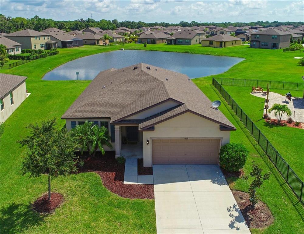 This gorgeous rarely available 4/3 home built in 2014 boasting beautiful lake views. i will call this the "triple split plan" guest room 2 offers an ensuite-it's like having two master suites! guest rooms 3 & 4 share a guest bath. the kitchen is complete with a custom tile backsplash, recessed lighting, and a floating island. making your way from the kitchen to the living space, you are greeted with an open floor plan that allows for entertaining. the space is flooded with natural light due to the sliding glass doors that lead to the patio overlooking the sparkling lake that makes for a serene outdoor experience and overall relaxing space. the grand master bedroom offers double tray ceilings with crown molding. inside the master bathroom we find a double vanity with large counter space, and a walk in shower. garage has a 4 foot extension, great for extra storage. in this beautiful neighborhood of harrison ranch you are offered many amenities that include a state of the art 6,500 sq ft community center, catering kitchen, 5 miles of walking trails, jr olympic pool, fitness center, tennis courts and more! "all our dreams can come true, if we have the courage to pursue them"~walt disneySingle Family House 4 bedrooms - HARRISON RANCH PH IIB