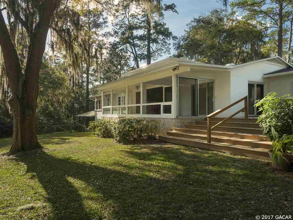 Classic mid-century home with stunning views overlooking a large and wooded lot. the main living room connects to a fully-enclosed florida room with truly magnificent views from the floor-to-ceiling glass windows. with five bedrooms, four and half bathrooms, and a bonus room, this home is extremely spacious. gorgeous oak wood floors in the main living area, the hall and four of the bedrooms. the master bedroom has tile floors, a large bathroom, dressing area and a private screened porch with beautiful views and a hot tub. the florida room and downstairs bonus room feature vintage cracked tile. all of the heavy lifting has been done to include a new roof in 2016, updated hvac in 2014 and new plumbing in 2013. the private location on 2.37 acres is close to several nature preserves and has a garden area with several raised beds. within five minutes of downtown gainesville, uf health, the university of florida and the new depot park, this is an easy and convenient place to call home.Single Family House 5 bedrooms - Kirkwood