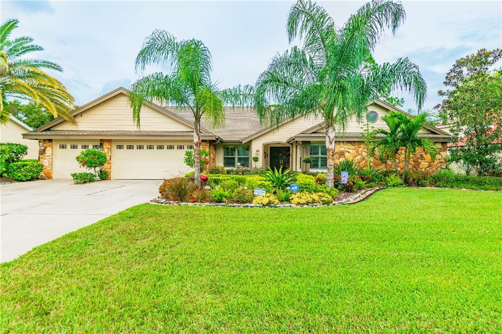 Beautifully updated rutenberg pool home in the quiet odessa community of belle meade. 3 or 4 bed | 2.5 bath | 3 car garage | heated pool | dead-end street | all located on one of the largest pond front lots in the community. meticulously maintained, this move-in-ready home welcomes you inside with vaulted ceilings, custom tile floors, ample natural light, and beautiful views of the pool and yard. the fully remodeled chef’s kitchen is at the heart of the home and features all wood cabinetry, travertine back splash, 4-seat breakfast bar, bay windows, stainless appliances, and eat-in area overlooking the family room and pool. master suite includes spa-like bathroom with double vanities, garden tub, tiled glass shower, double closets, and lanai access. split plan layout with well-appointed guest bedrooms, remodeled 2nd bath with herringbone tiled shower, dedicated guest ½ bath, separate office/den, open living room with wood burning brick fireplace, full wet bar, and separate formal dining and living rooms. enjoy complete privacy on the large covered lanai including fully screened heated pool, travertine deck, and outdoor kitchen. the expansive back yard has an abundance of green space and multiple sitting areas to enjoy the peaceful pond views. improvements include; new low e, impact resistant, insulated windows and sliding doors- 2010, new trane a/c - 2017,new exterior paint – 2018, new garage doors – 2013, new landscaping – 2019. belle meade has low hoa fees and is zoned for all top rated schools!Single Family House 3 bedrooms - BELLE MEADE