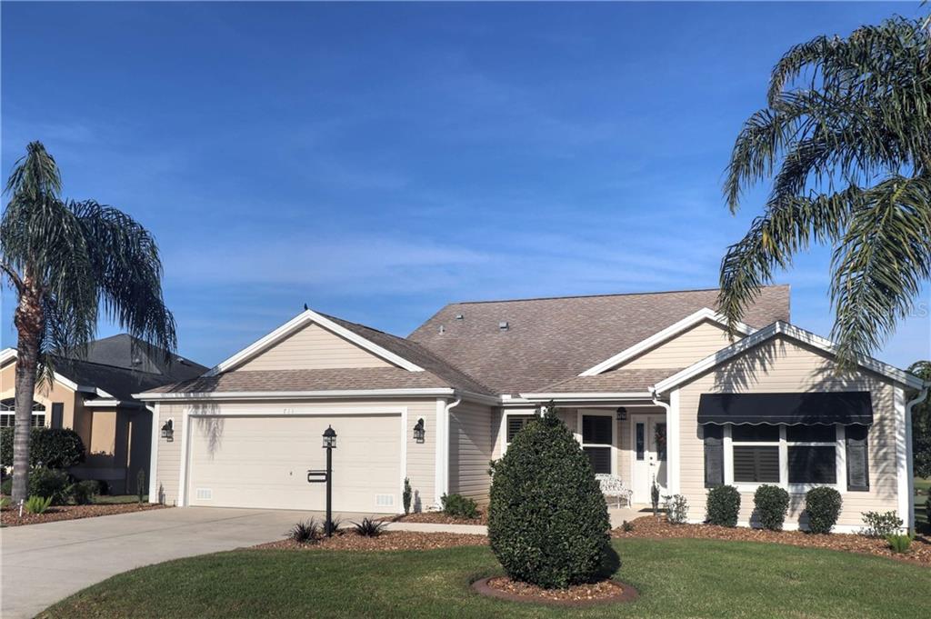 New price this home shows like a premier, a gorgeous stretched camellia you will see the spectacular view of the golf course and two ponds. a beautiful front door looks into the beautiful tiled flooring in the living areas and large florida room. the bedrooms have newer carpet and the third bedroom does not have a closet but has been made into a wonderful den area with a built in office. all the windows in this home have plantation shutters. the master bedroom has slidingwooden shutters on the slider doors to the florida room. the kitchen has a nice nook area with bead board and a chair rail. corion counters with over and under counter lighting and a new stainless refrigerator and pull outs in every cabinet. a buffet or barstools fit perfectly at the bar. the dining room is framed by columns and open to the living room. you can go directly into the large florida room that has double pane glass windows and pull down shades. from there you have a panoramic view of the golf course and can go onto the birdcage which has an awning. sit in the inground spa and enjoy the view and marvelous sunsets. the master bedroom has two large walk-in closets, double sinks in the bathroom, corion counter tops and a pocket door to the shower and water closet. there is a new washer and dryer in the inside laundry, garage has been stretched to fit two cars and a golf cart. it has pull down steps, an attic fan, sealed flooring and lots of cabinets. for storage. bond paid taxes $2748.10, maint $499.27, fire $124Single Family House 3 bedrooms - THE VILLAGES