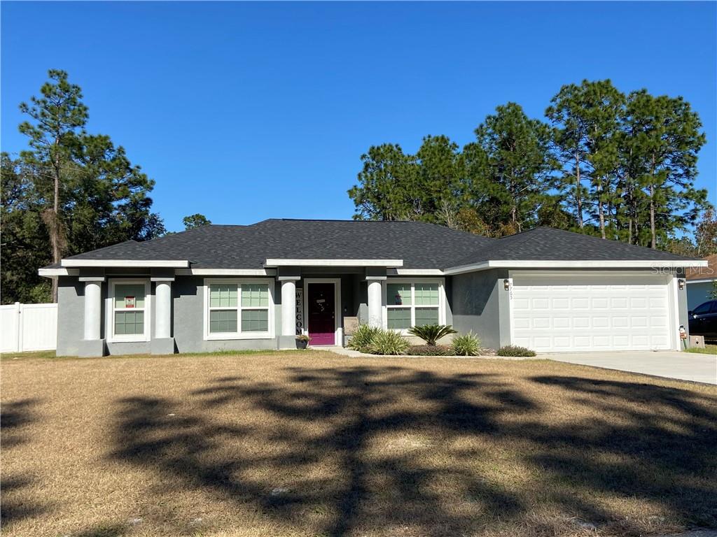 Beautiful 3 bedroom 2 bath home, built in 2019, with vinyl fenced back yard. tile wood like floors, covered lanai granite counter tops in kitchen and baths.master bath with garden tub, tiled shower, with two sinks and and private toilet area. walk in closets. vaulted ceilings, stainless steel refrigerator, stove and microwave, and dishwasher. priced right!Single Family House 3 bedrooms - MARION OAKS NORTH