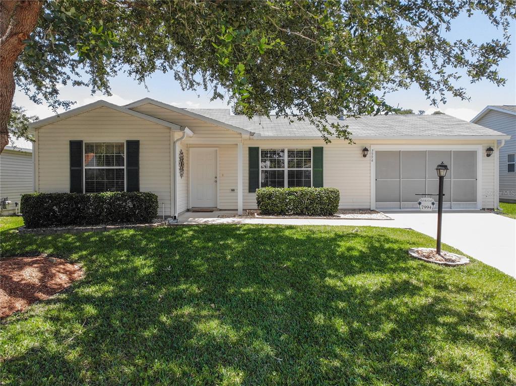 Bond paid! lovely 2 bedroom, 2 bath austin ranch in the village of chatham. this well-appointed home welcomes you with a pristine lawn and landscaping with a mature oak tree providing beauty and shade to the front yard. as you enter this immaculate home, the vaulted ceiling and open kitchen provide a comfortable and open feel. plank flooring flows throughout the living and dining, vinyl tile in the kitchen and carpet in both bedrooms. the lovely kitchen comes with stainless steel appliances, breakfast bar, gas range, and oak cabinets and laminate countertops. the kitchen is open to the dining room and spacious living room that opens through sliding glass doors to the huge screened birdcage lanai off the back of the home. an additional grilling pad is perfect for entertaining family and friends! the large master bedroom has a walk-in closet, ensuite master bathroom with solar tube, shower, and tons of counter space for all your needs. the guest bedroom has a double-door closet for extra storage. the guest bathroom comes with a tub/shower combo and lots of space for your guest's needs. the stretched screened garage allows for one car, a golf cart, washer, dryer, and wash-out sink with extra shelving for added storage space. enjoy life in this exclusive portion of the villages north of 466 with championship golf courses, numerous tennis, pickleball, and shuffleboard courts, and plenty of shopping and restaurants just a golf cart ride away. this home is a must see, come by, and take a look! don't forget bond is paid!7994 SE 174TH BELHAVEN, THE VILLAGES, FL 32162