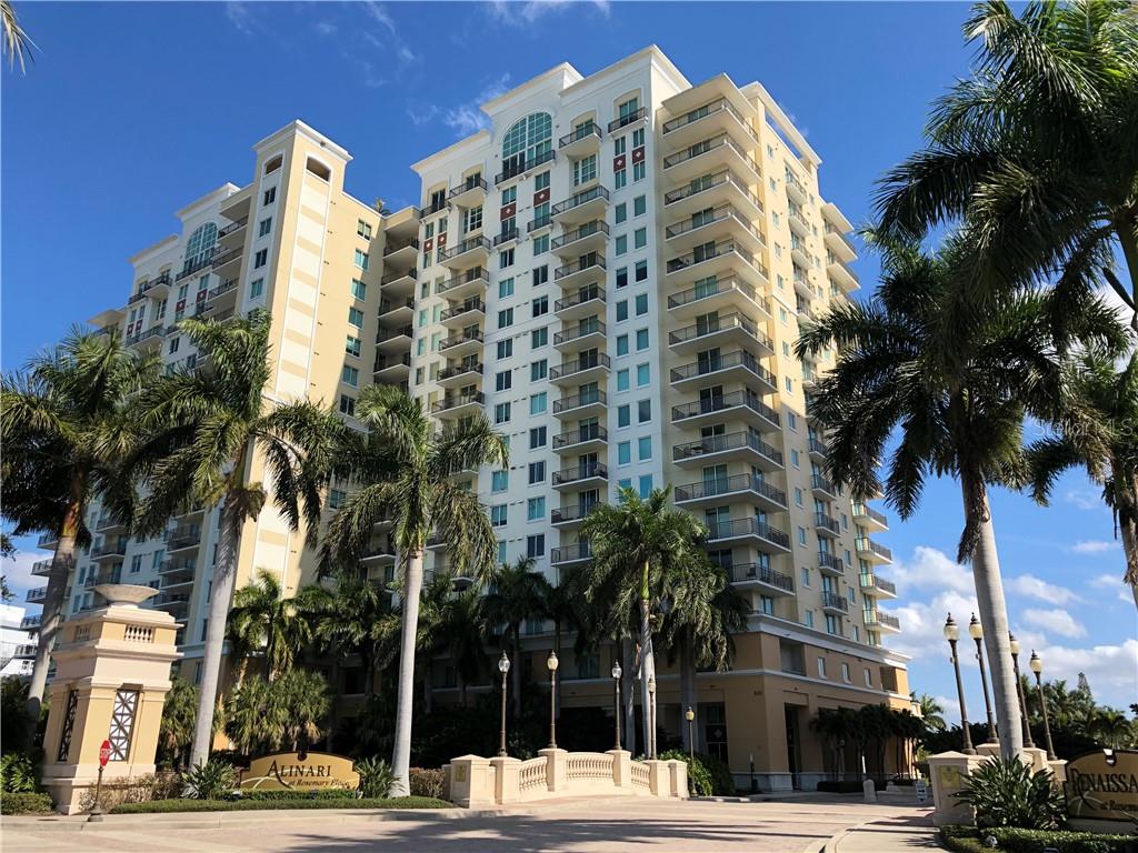 This stunning unit is not to be missed. located on the northwest corner of the alinari, this 8th floor 2-bedroom 2-1/2 bath unit offers stunning views. balcony on the livingroom and main bedroom provide gorgeous water views by day and sunset views each evening. featuring an open floor plan with a modern custom chandelier as you enter and beautifully painted with detail. modern kitchen with custom cabinetry and stainless steel appliances. the master suite is very spacious with floor to ceiling windows and a walk-in closet. the master bath features dual sinks, a large soaking tub with a separate shower. amenities at the alinari are designed for those with a taste for luxury; large lap pool with hot tub, outdoor gas grill, fitness center, bike racks, under-building parking, club room with full bar, climate controlled wine storage (extra fee), movie theater, billiard/game room, conference room and library. nestled in the heart of sarasota's art district, ainari is a short distance to shopping, theaters and sites. this pet-friendly abode has a private green-space to enjoy with your pets. bonus features include; custom paint, mirrored entrance wall, custom half moon columns/tiling, 3” shades in living area/kitchen, plantation shades in 2nd bedroom and main bath, custom linen drapery with blackout lining and custom rods, remote control fans in bedrooms, dimmer switches throughout, upgraded exhaust fans in bathrooms, enlarged columns on kitchen counter, granite, custom cherry cabinets and new hot water heater.Condo Apartment 2 bedrooms - ALINARI